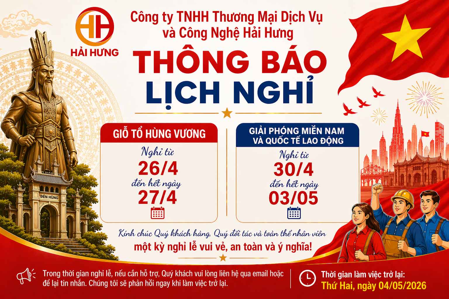 Thông báo lịch nghỉ lễ Giỗ Tổ Hùng Vương và Giải Phóng Miền Nam, Quốc Tế Lao Động